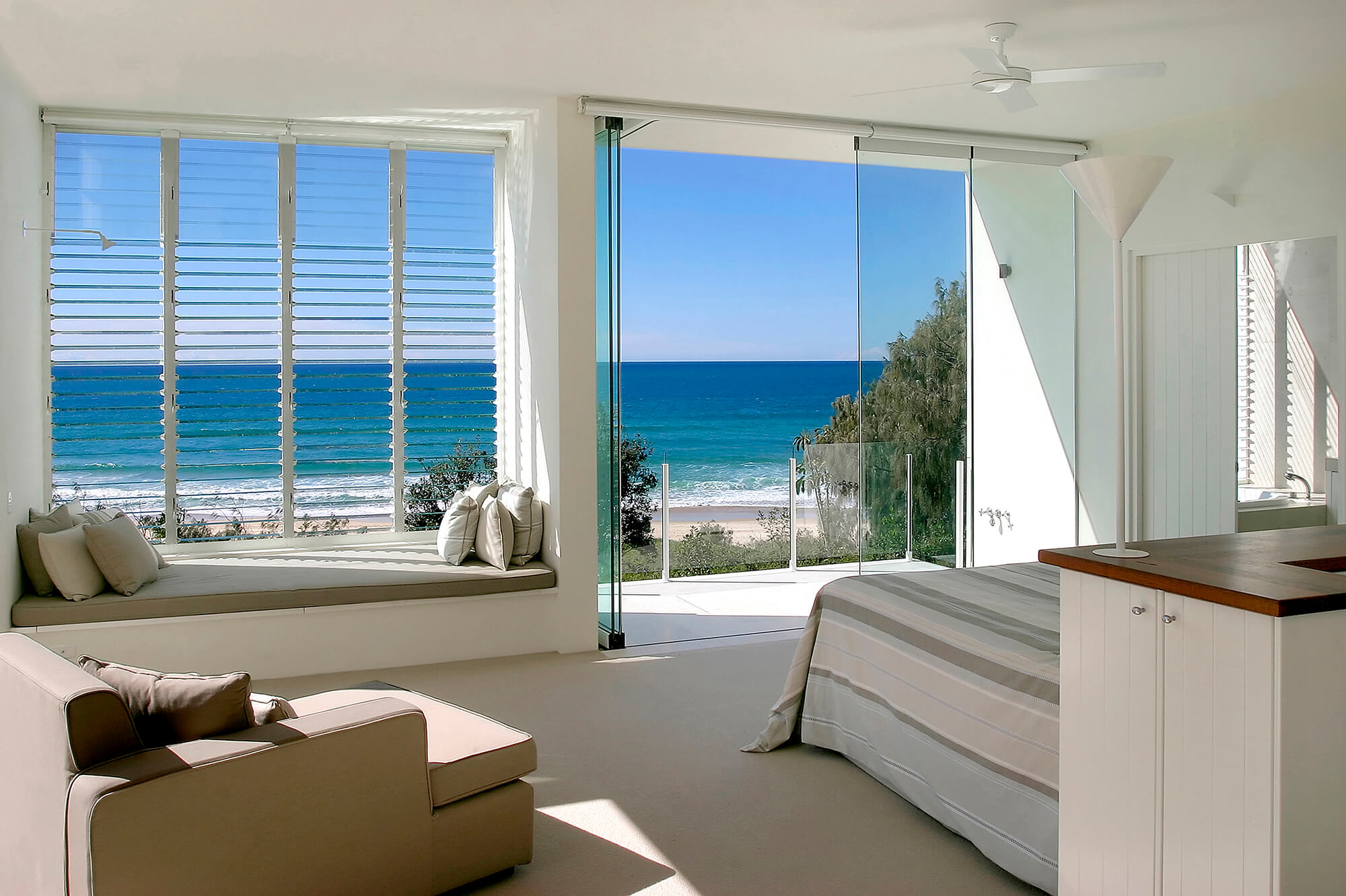 Louvre windows in a bedroom offer privacy, while still allowing for fresh air and gentle sunlight, creating a serene and comfortable sleeping environment.