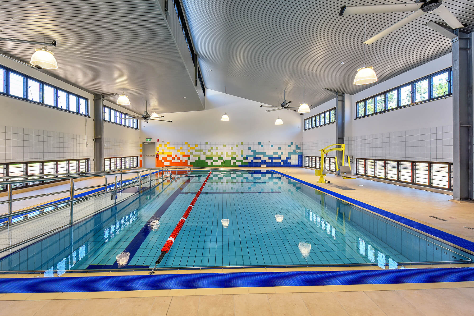 Louvre windows in a sporting facility offer efficient temperature control and air circulation, creating a comfortable environment for athletes and spectators.