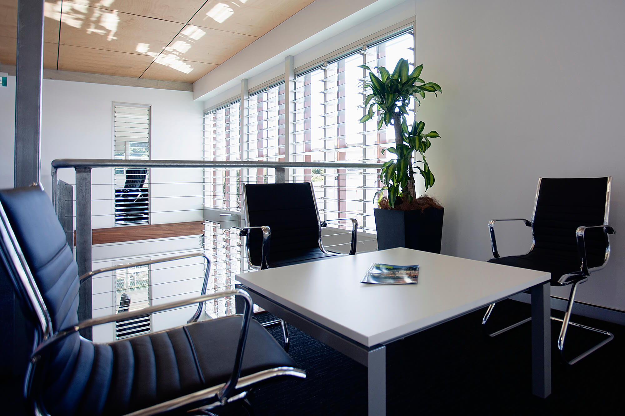 Louvre windows in an office provide adjustable ventilation and natural light, promoting a productive and comfortable workspace.